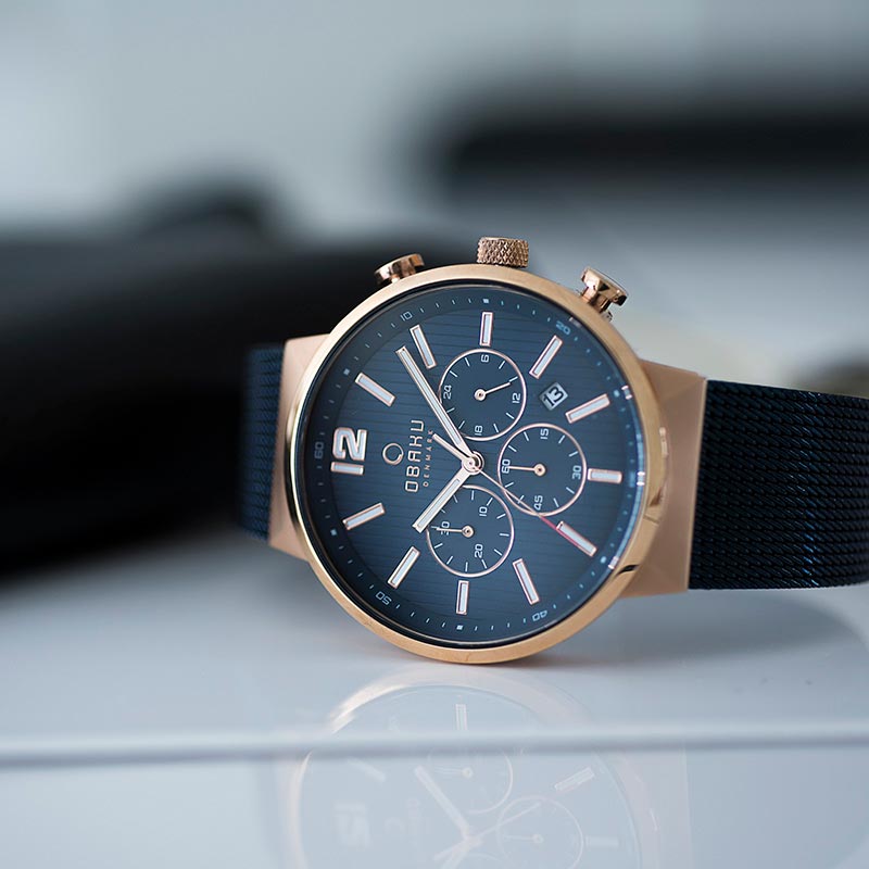 The Storm Ocean is as the name implies a timepiece full of magnificent details and the color blue as main element. The bracelet is made of a blue coated stainless steel mesh that is combined with a rose gold coated case that encircles a blue dial and a chronograph movement with smaller separated dials beautifully embedded. The hands are white surrounded by a narrow rose gold coated edge making the design powerful and luxurious – designed by the Danish Christian Mikkelsen.