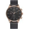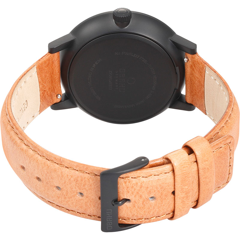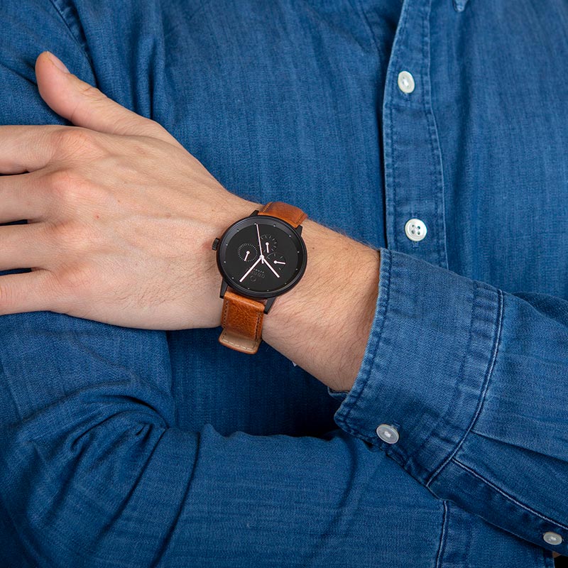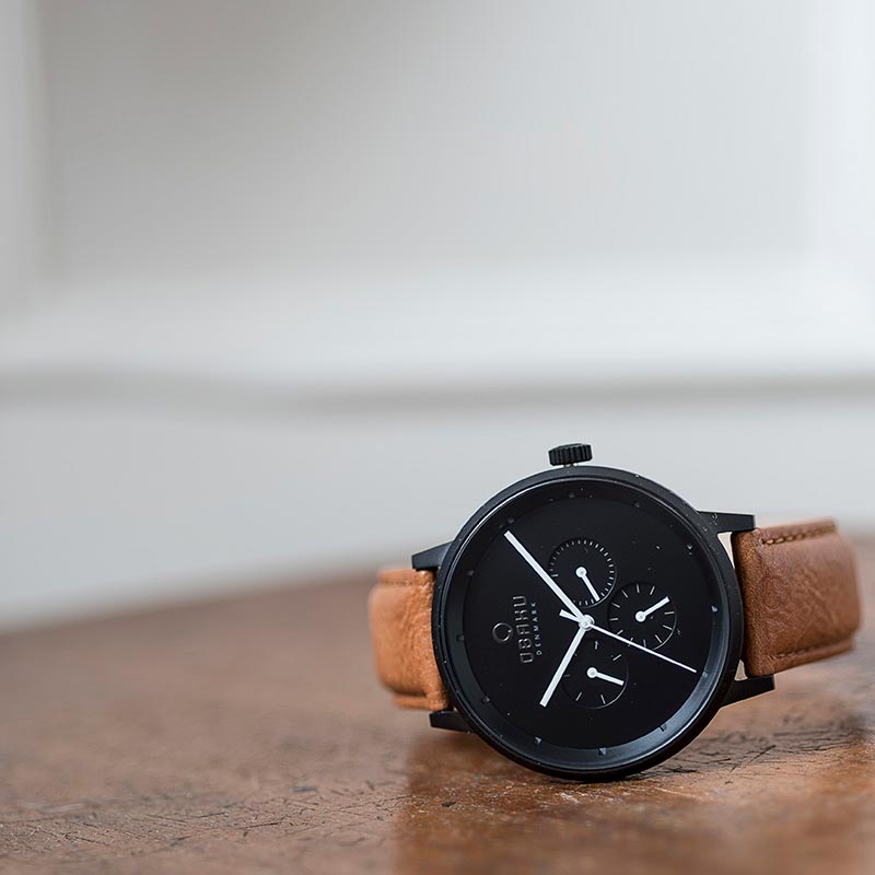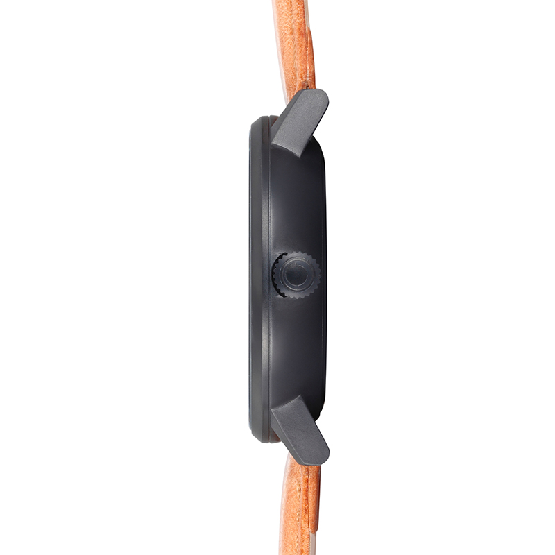 The Venlig Tan timepiece features an innovative combination of both colors and materials. It combines a light brown calf leather strap with a matt-black coated steel case and a black dial and a multi-functional movement. The hands are white which emphasizes the contrast between black and white creating a classic design with a present twist within colors and materials. The design is created by the Danish designer Christian Mikkelsen.