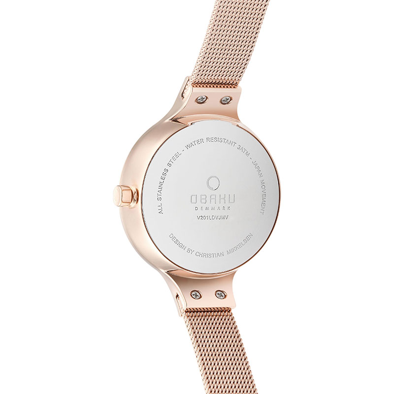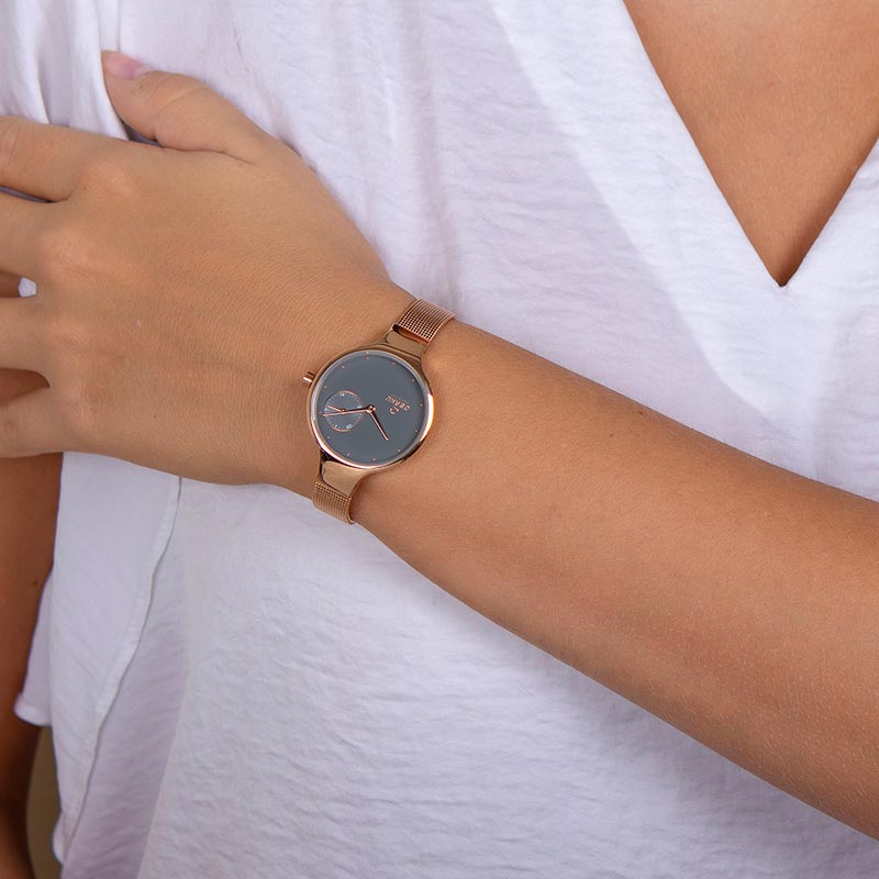 The Eng Blush is a beautifully detailed timepiece with a modern and sophisticated color composition created by the Danish designer Christian Mikkelsen. Our watch is made from a delicate rose gold coated stainless steel bracelet and a rose gold coated case that surrounds a grey ceramic dial with an embedded date function – creating a spectacular modern and feminine design.