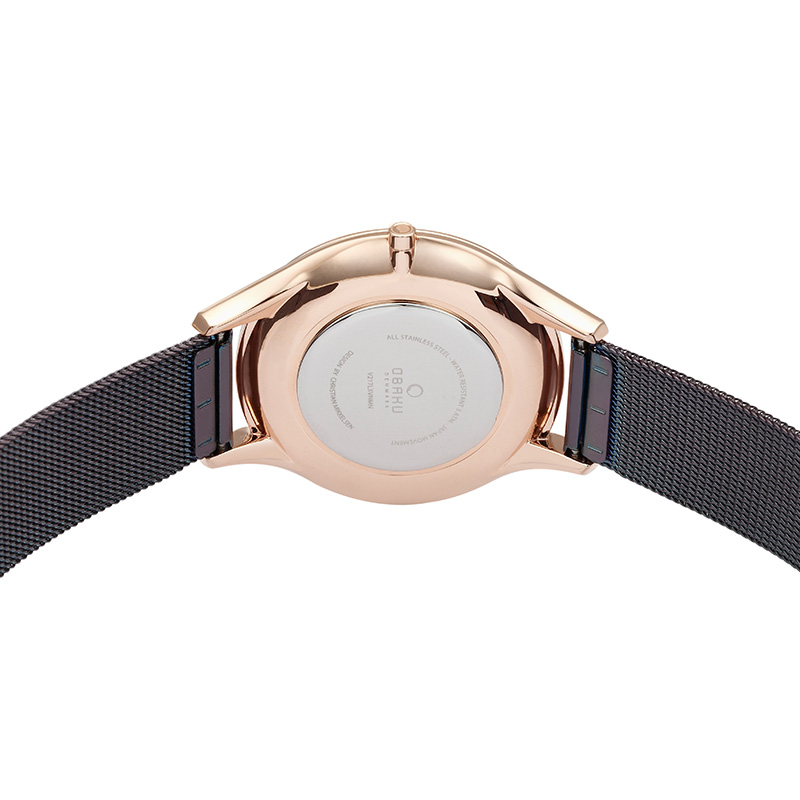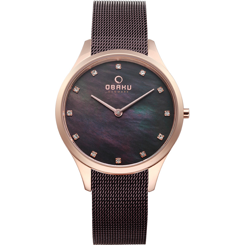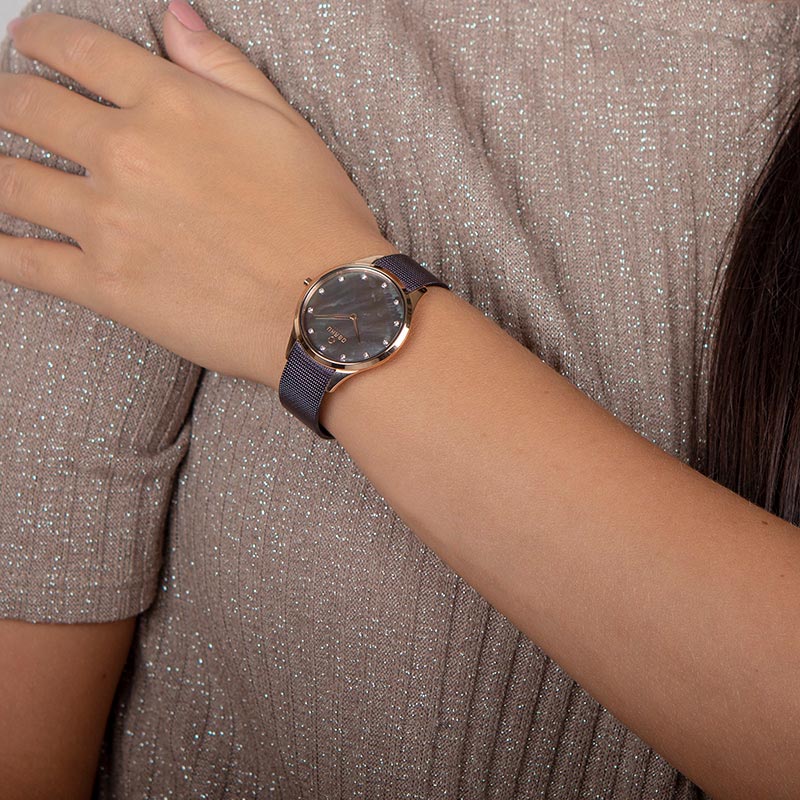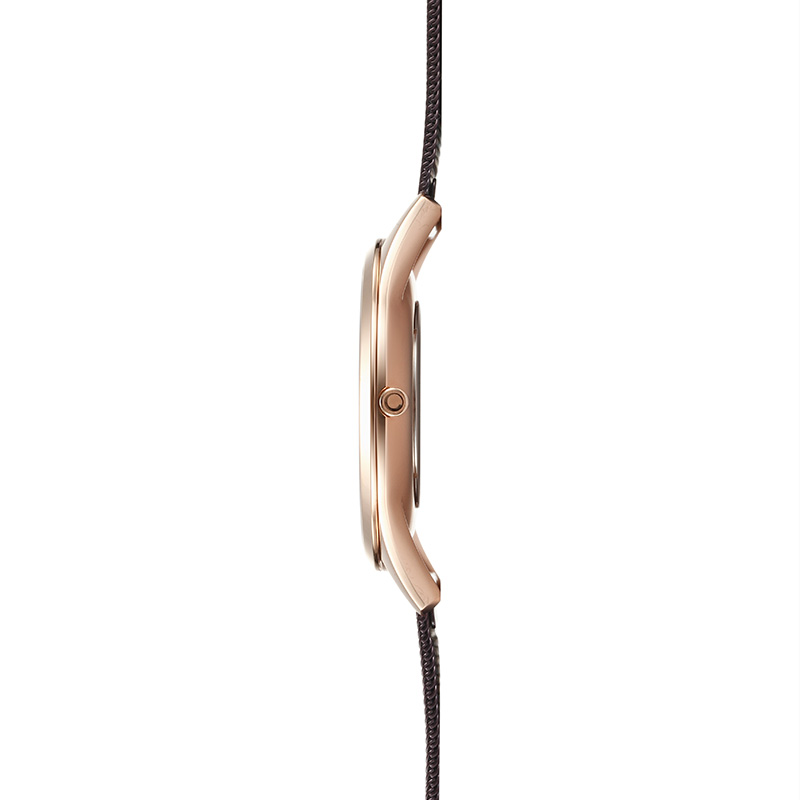 The Fin Walnut is an ultra slim case that looks paper thin when seen from the side. This elegant timepiece has a graceful mother of pearl dial with Swarovski crystals that are surrounded by a complimenting rose gold coated steel case and a brown coated mesh bracelet. It is a great combination of warm colors and a beautiful design created by the Danish designer Christian Mikkelsen.