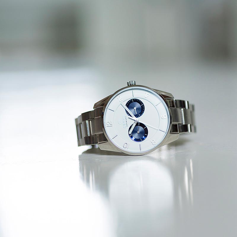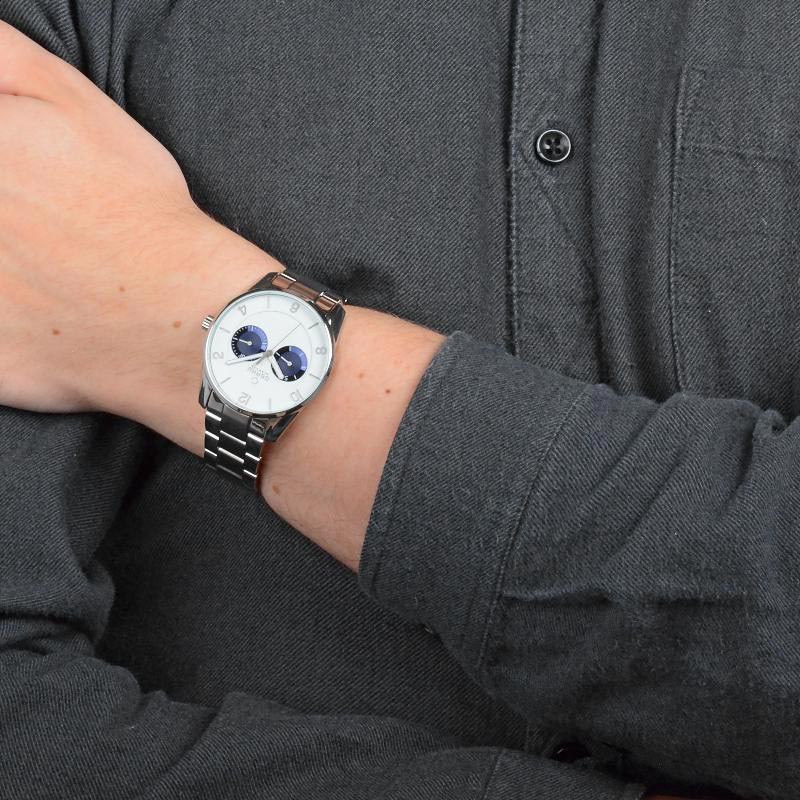 The Flint Brace is a perfect example of a timeless and sophisticated timepiece designed by Christian Mikkelsen. The stainless steel link band bracelet surrounds the steel case with the white dial and a multi-functional blue coated movement. The hands are white-silver coated and are an elegant contrast to the silver coated Arabic figures embedded in the dial. The Flint Brace will suit the modern and minimalistic man.