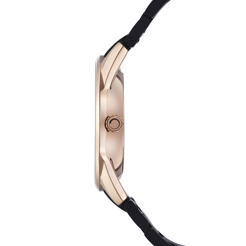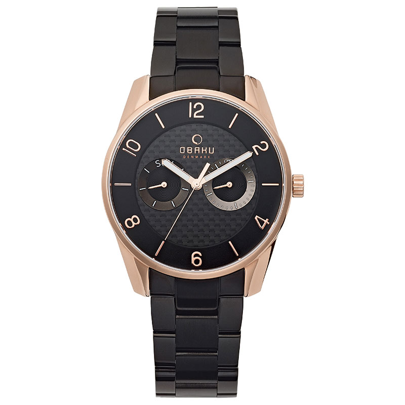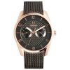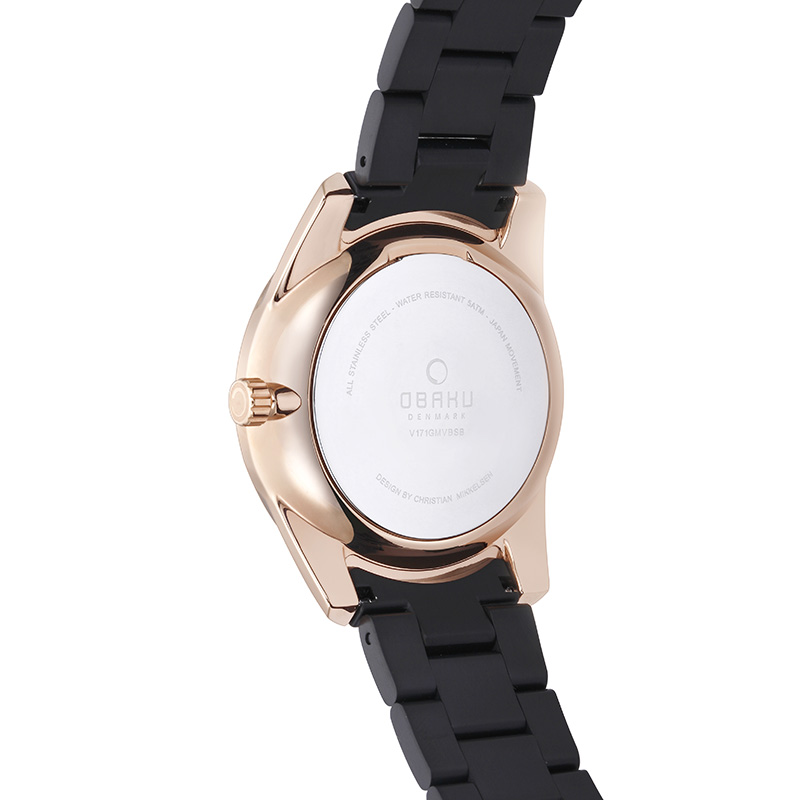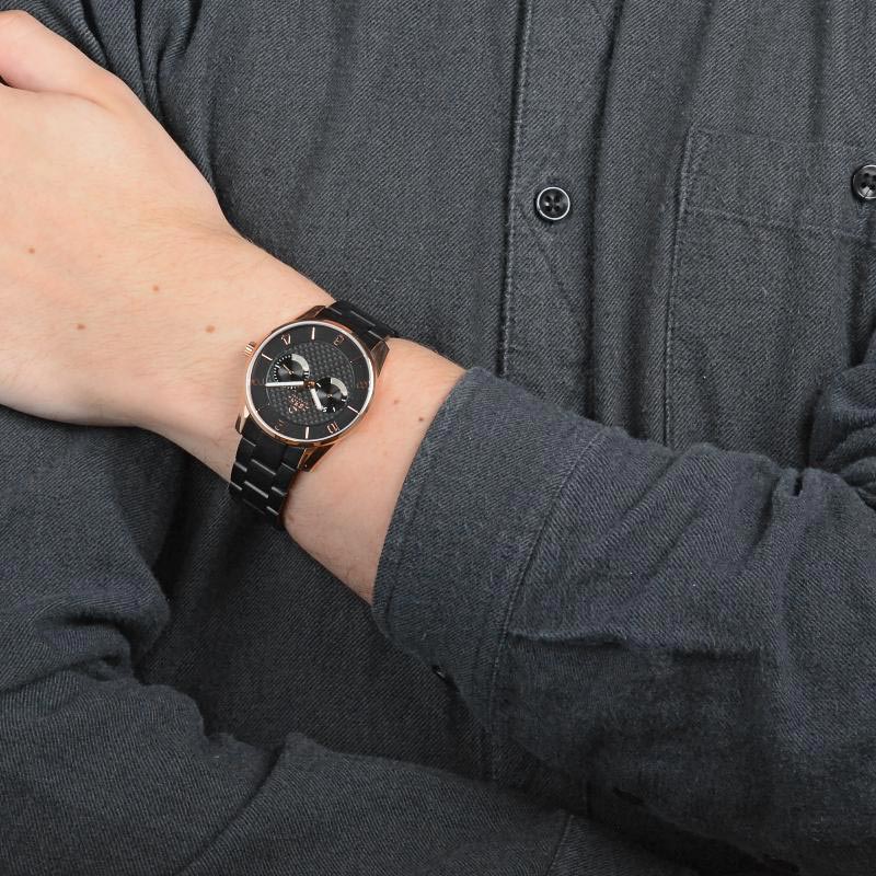 The Flint Ink is a beautifully detailed timepiece for men designed by the Danish designer Christian Mikkelsen. Our watch features a black coated link band bracelet with a rose gold coated steel case that encircles a multi-functional movement with a black dial and a spectacular braided pattern inside it along with white-rose gold coated hands and Arabic figures. Our timepiece is an elegant composition of small yet noticeable details that creates the perfect watch for the modern man.