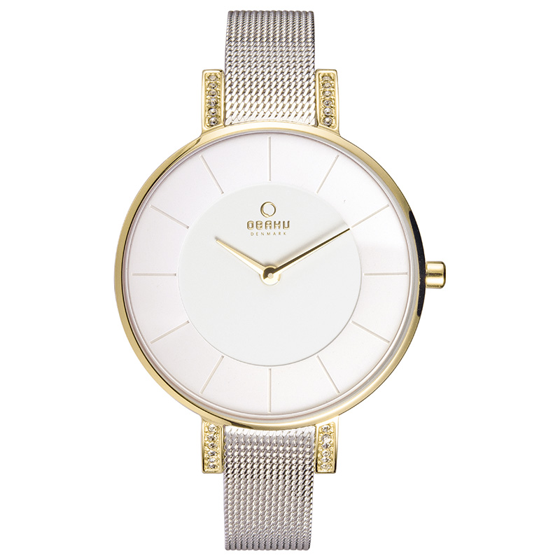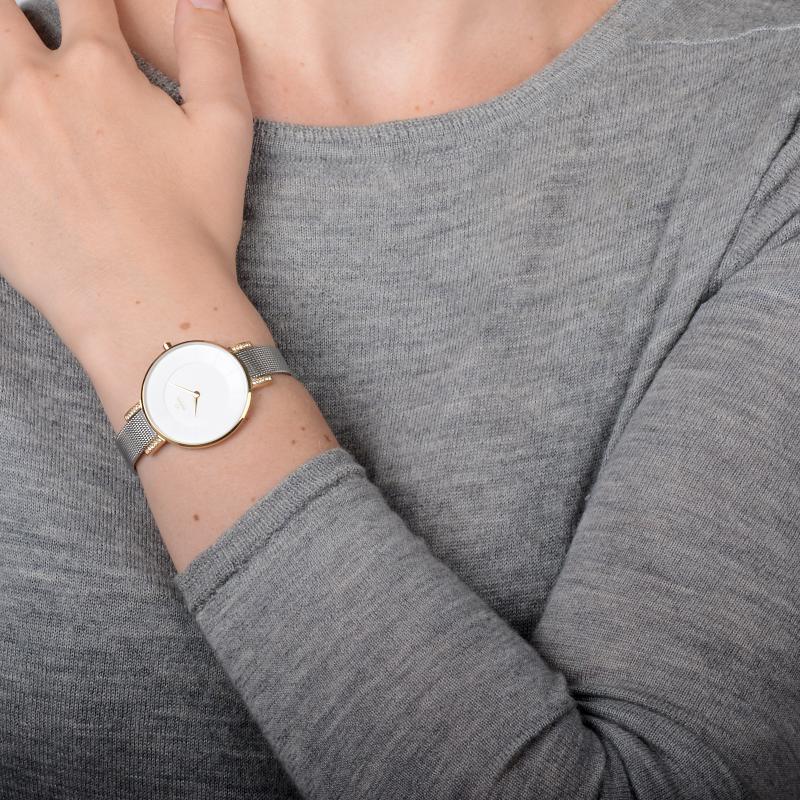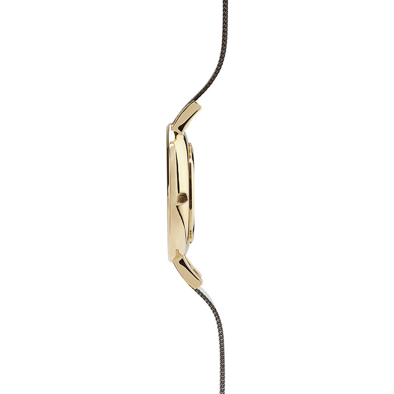 The Lun Gold BI is a spectacular combination of feminine details colors and high quality materials designed by Danish designer Christian Mikkelsen. The case is gold coated steel with locks that are embedded with Swarovski crystals. Additionally the case features gold coated hands and a white dial that is encircled by a stainless steel mesh bracelet. Our timepiece is both classy and elegant and will suit the modern woman perfectly.