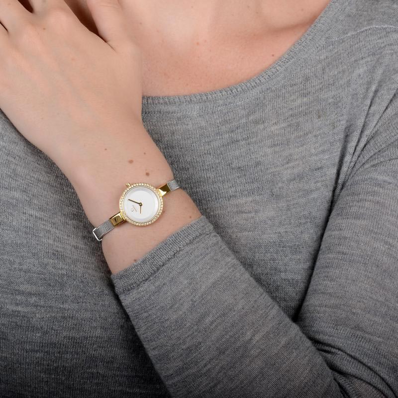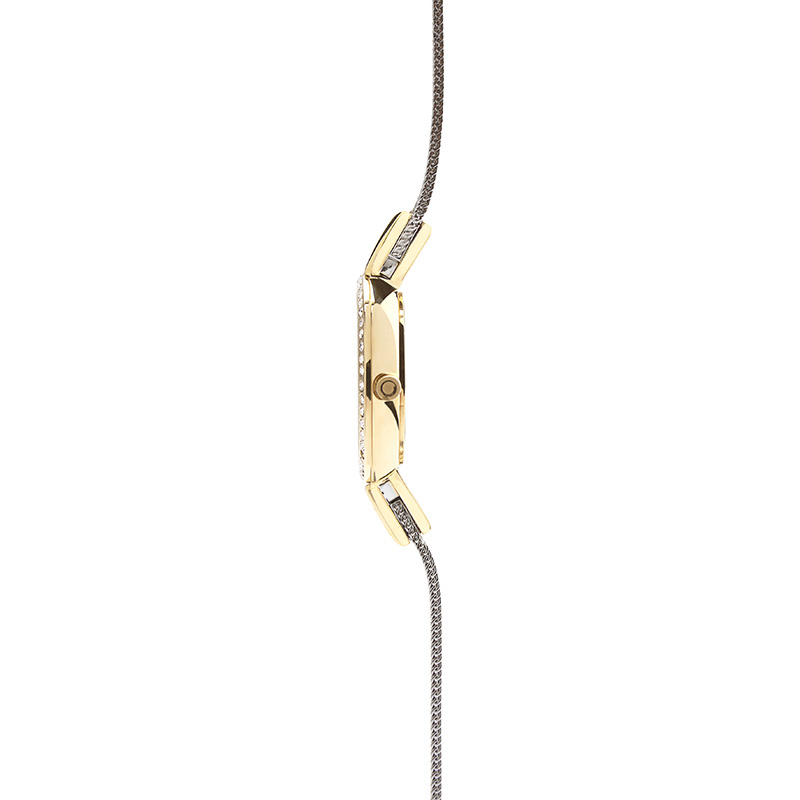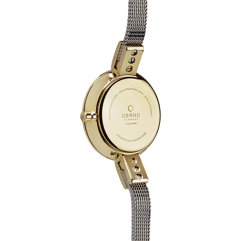 Siv Glimt Gold BI is a genuine symphony of sparkle and shine with its Swarovski crystals a beautiful white dial in a gold coated stainless steel case and a stainless steel mesh bracelet. It is designed by Danish designer Lau Liengård Ruge who has managed to combine different colors and materials into one spectacular design.