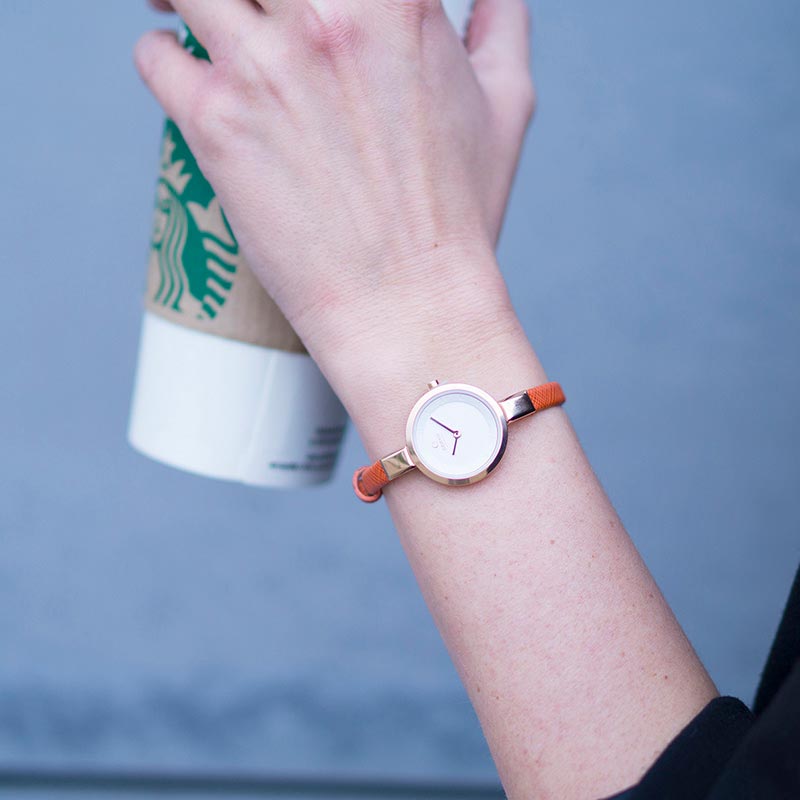 The Siv Pumpkin is designed by the Danish designer Lau Liengård Ruge. It consists of warm colors combined with luxury materials. The case is gold coated steel with a white dial that is surrounded by a warm pumpkin coated calf leather strap. The timepiece really emphasizes the beauty of warm colors and will look pretty on any wrist.