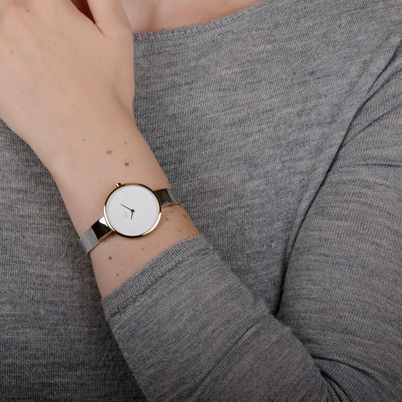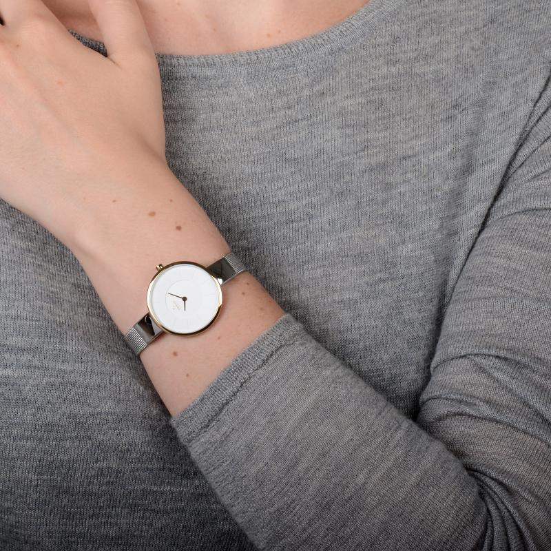 The Sol Gold BI is a beautiful combination of feminine colors and quality materials created by the Danish designer Christian Mikkelsen. The case is made from gold coated steel that is surrounding a white dial and the bracelet is made from stainless steel mesh which greatly complement the additional materials and colors making it an extravagant timepiece for women.