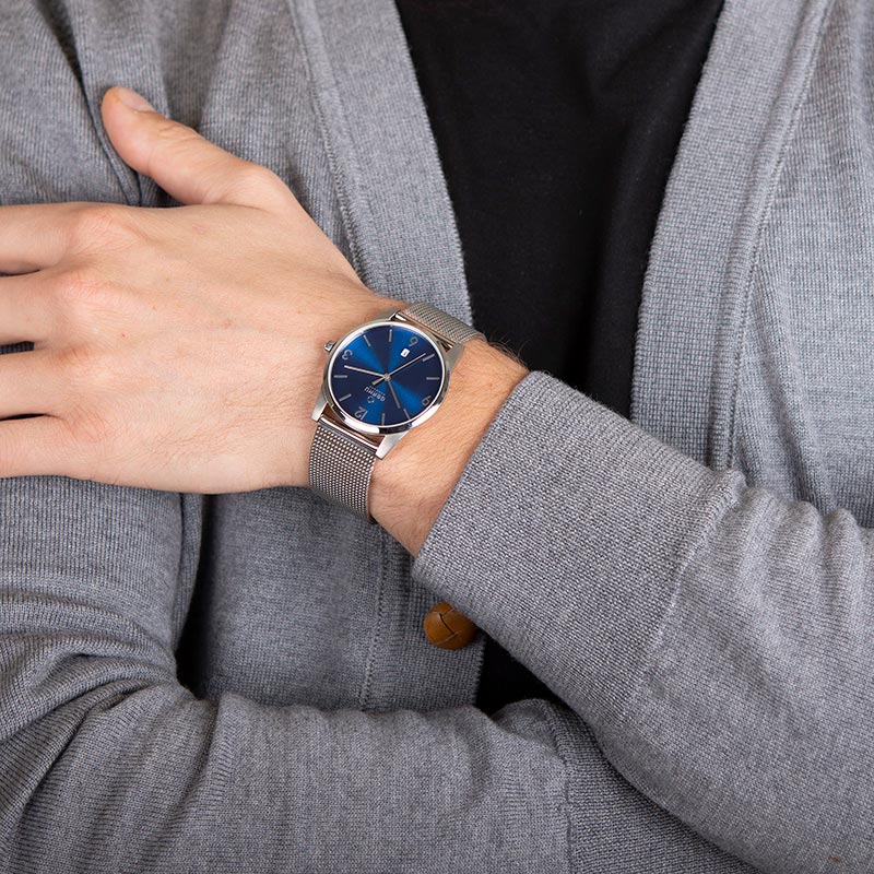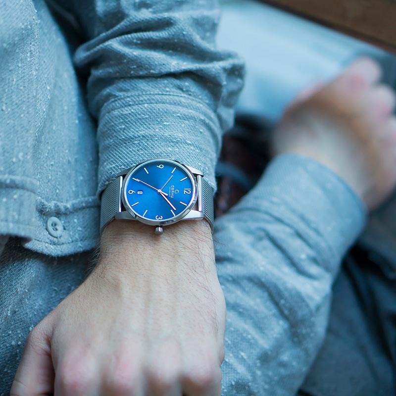 Masculine extravagant and luxurious are some of the words used to describe the Sten Cyan timepiece designed by the Danish designer Christian Mikkelsen. It features an elegant stainless steel bracelet a steel case and a blue dial with embedded Arabic figures and steel coated hands. Our timepiece is perfect for the modern man who appreciates a simple and classic design that goes well with any outfit on any occasion.