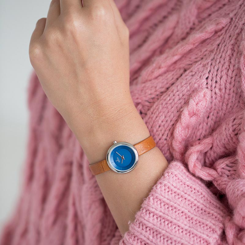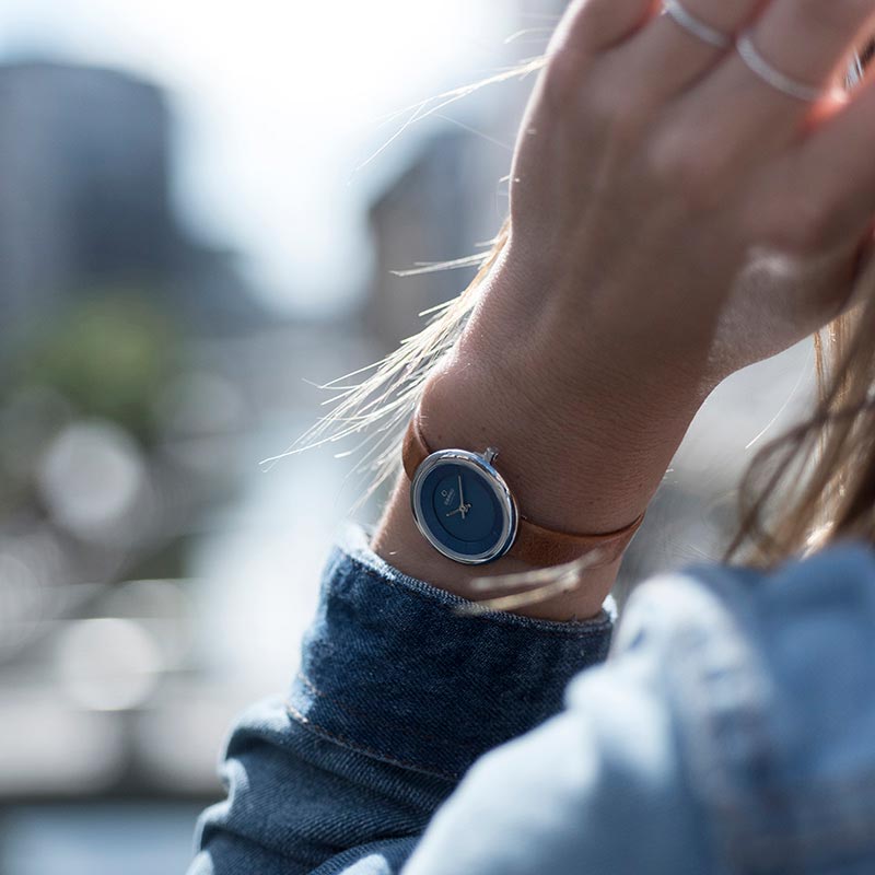 “Stille” means quiet in Danish. It symbolizes our Stille Syrup timepiece greatly because of its clean lines and simple yet powerful design. The design features a smooth brown calf leather strap along with a steel case and a blue dial – creating the perfect calm and “stille” expression. The design is created by the Danish designer Christian Mikkelsen.