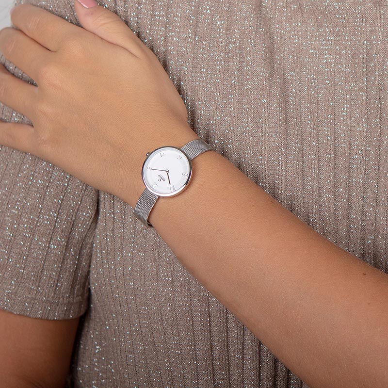 Elegant chic and classy are the quintessence of the Vand Steel timepiece designed by Christian Mikkelsen. It features a steel case and a white dial with Arabic figures embedded surrounded by a stainless steel mesh bracelet. The design is simple and timeless – making it the perfect timepiece for the modern woman.