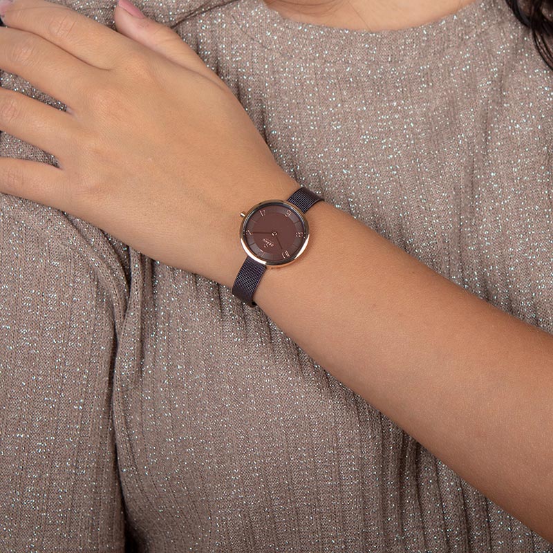 Vand Walnut is a beautiful timepiece for women designed by the Danish designer Christian Mikkelsen. It is a minimal watch created to expresses Scandinavian elegance. Vand Walnut features a brown dial with a numbered index surrounded by a rose gold coated steel case. The mesh bracelet made out of the same material as the watch is a dark brown color with a hint of purple. This watch is meant for the outgoing and modern woman who loves dark colors.