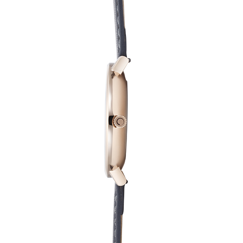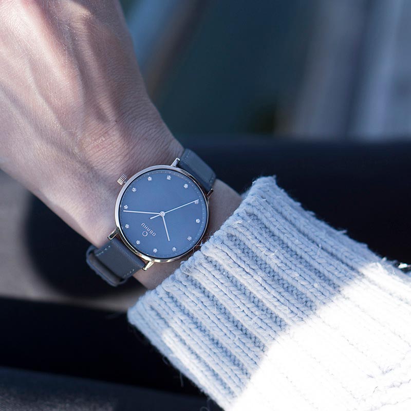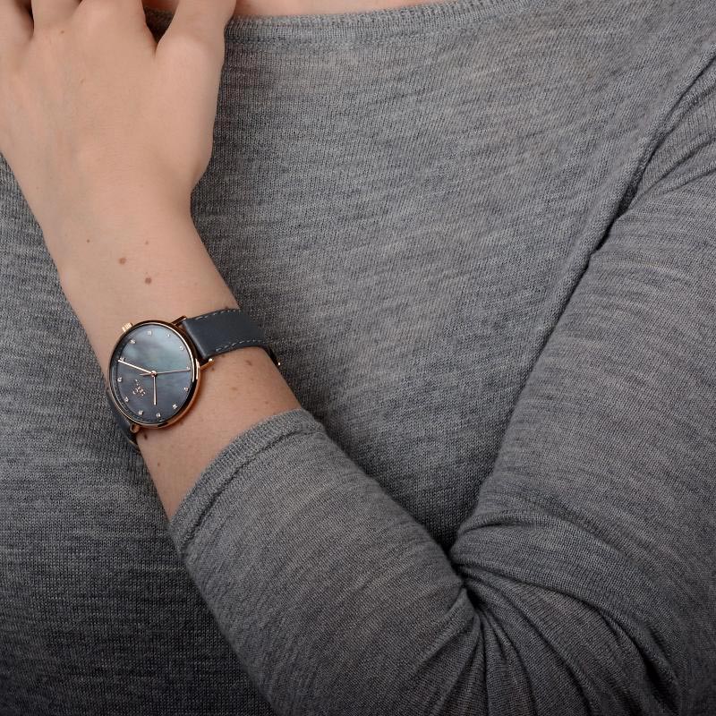The Vest Pebble watch is perfect for the woman who adores exclusive details in a design. Our timepiece has a spectacular black mother of pearl dial embedded with Swarovski elements that are surrounded by a flattering rose gold coated steel case and a smooth grey calf leather strap composited by the designer Christian Mikkelsen. Full of striking and feminine details the Vest Pebble aims to please the selective woman.